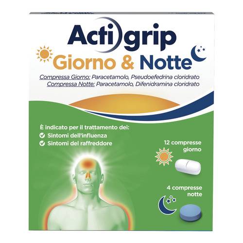 Di seguito vengono riportati gli effetti indesiderati, registrati in seguito all'assunzione di Actigrip Giorno e Notte. La frequenza degli effetti indesiderati e' definita mediante la seguente convenzione: molto comune (>=1/10); comune (>=1/100 e <1/10); non comune (>=1/1,000 e <1/100); raro (>=1/10,000 e <1/1,000); molto raro (<1/10,000); non nota(non puo' essere definita sulla base dei dati disponibili). Effetti indesiderati molto comuni. Patologie gastrointestinali: dolore addominale o dello stomaco, dispepsia, diarrea e vomito, secchezza della gola.Patologie del sistema nervoso: mal di testa, sonnolenza, sedazione, eccitazione, aumento della sudorazione, disturbi del sonno. Patologie dell'occhio: visione alterata. Patologie della cute e del tessuto sottocutaneo: rash cutanei, orticaria. Patologie respiratorie, toraciche emediastiniche: secchezza del naso. Effetti indesiderati comuni. Patologie della cute e del tessuto sottocutaneo: prurito, dermatite da contatto, infiammazione della pelle o delle mucose. Patologie cardiache: ipotensione ortostatica/posturale, aritmia, tachicardia. Patologie del sistema nervoso: tinnito, atassia, euforia e tremori, ipotensione, diminuzione delle secrezioni mucose. Patologie dell'occhio: diplopia, visione alterata, glaucoma, glaucoma ad angolo chiuso. Patologie gastrointestinali: disturbi dell'epigastrio. Patologie respiratorie, toracichee mediastiniche: dispnea. Patologie renali e urinarie: ritenzione urinaria. Disturbi del metabolismo e della nutrizione: iperamilasemia. Patologie sistemiche e condizioni relative alla sede di somministrazione:fatica, astenia. Patologie epatobiliari: disturbi della funzionalita'epatica. Effetti indesiderati non comuni. Patologie della cute e deltessuto sottocutaneo: eruzione fissa da farmaco (FDE), eritema multiforme, esantemi. Patologie renali e urinarie: insufficienza renale acuta, nefrite interstiziale, ematuria, anuria. Patologie gastrointestinali: costipazione. Patologie respiratorie, toraciche e mediastiniche: starnuti, secchezza della faringe e dell'albero bronchiale. Patologie della cute e del tessuto sottocutaneo: fotosensibilizzazione. Patologie del sistema nervoso: depressione centrale, confusione mentale, disturbidella funzione cognitiva. Effetti indesiderati rari. Patologie endocrine: ipertiroidismo. Patologie renali e urinarie: necrosi papillare renale. Patologie del sistema nervoso: allucinazioni e incubi manie secondarie, ansia, disturbi psichiatrici, forti mal di testa, riduzione della memoria o della concentrazione, convulsioni. Patologie del sistemaemolinfopoietico: discrasie del sangue, agranulocitosi, anemia, anemia emolitica, trombocitopenia. Disturbi del sistema immunitario: shockanafilattico, edema della laringe. Patologie epatobiliari: epatiti. Patologie gastrointestinali: pancreatite. Effetti indesiderati molto rari. Patologie del sistema emolinfopoietico: leucopenia, neutropenia, pancitopenia. Patologie cardiache: angina, aumento del segmento ST, infarto miocardico, ipertensione, edema. Patologie della cute e del tessuto sottocutaneo: angioedema. Patologie epatobiliari: epatotossicita'. Disturbi del sistema immunitario: sindrome da shock tossico. Effetti indesiderati non noti. Patologie del sistema nervoso: stato confusionale, irritabilita', agitazione, coordinazione anormale, parestesia, iperattivita' psicomotoria, sentirsi nervoso, accidente cerebrovascolare*,sindrome da encefalopatia posteriore reversibile (PRES) (vedere paragrafo 4.4), sindrome da vasocostrizione cerebrale reversibile (RCVS) (vedere paragrafo 4.4). Esami diagnostici: transaminasi aumentate, pressione arteriosa aumentata. Patologie della cute e del tessuto sottocutaneo: esantema pruriginoso, gravi reazioni cutanee, inclusa pustolosi esantematica acuta generalizzata (AGEP) (vedere paragrafo 4.4). Patologie renali e urinarie: disuria. Patologie respiratorie, toraciche e mediastiniche: fastidio al torace. Patologie cardiache: palpitazioni. Disturbi del sistema immunitario: ipersensibilita'. Disturbi psichiatrici:allucinazione visiva. Patologie gastrointestinali: colite ischemica*(vedere paragrafo 4.4). Patologie dell'occhio: neuropatia ottica ischemica. *reazioni avverse raccolte durante l'esperienza post-marketing con pseudoefedrina. Segnalazione delle reazioni avverse sospette. La segnalazione delle reazioni avverse sospette che si verificano dopo l'autorizzazione del medicinale e' importante, in quanto permette un monitoraggio continuo del rapporto beneficio/rischio del medicinale. Agli operatori sanitari e' richiesto di segnalare qualsiasi reazione avversasospetta tramite il sistema nazionale di segnalazione all'indirizzo https://www.aifa.gov.it/content/segnalazioni-reazioniavverse.