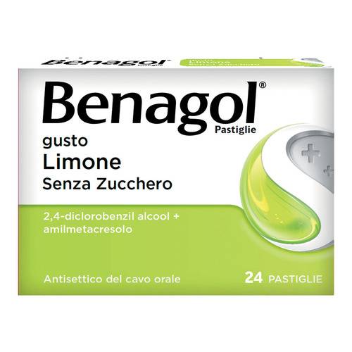 Benagol Pastiglie gusto Ginger e Spezie. Principi attivi: 2,4-diclorobenzil alcool 1,2 mg; amilmetacresolo 0,6 mg. Eccipienti con effetti noti: saccarosio liquido, glucosio liquido (contenente solfiti e amido di frumento), aroma spezie e aroma ginger (contenenti cinnamale, citrale, citronellolo, eugenolo, farnesolo, geraniolo, isoeugenolo e linalolo). Benagol Pastiglie gusto Miele e Limone. Principi attivi: 2,4-diclorobenzil alcool 1,2 mg; amilmetacresolo 0,6 mg. Eccipienti con effettinoti: glucosio liquido (contenente solfiti e amido di frumento), saccarosio liquido, menta essenza e limone essenza (contenenti citrale, d-limonene, geraniolo e linalolo), miele (zucchero invertito). Benagol Pastiglie gusto Limone Senza Zucchero. Principi attivi: 2,4-diclorobenzil alcool 1,2 mg; amilmetacresolo 0,6 mg. Eccipienti con effetti noti:maltitolo liquido, isomalto, aroma di limone (contenente alcol benzilico, citrale, citronellolo, d-limonene, geraniolo e linalolo). BenagolPastiglie gusto Fragola Senza Zucchero. Principi attivi: 2,4-diclorobenzil alcool 1,2 mg; amilmetacresolo 0,6 mg. Eccipienti con effetti noti: maltitolo liquido, isomalto, aroma di fragola (contenente propilene glicole e alcol benzilico). Benagol Pastiglie gusto Menta Fredda. Principi attivi: 2,4-diclorobenzil alcool 1,2 mg; amilmetacresolo 0,6 mg. Eccipienti con effetti noti: saccarosio liquido, glucosio liquido (contenente solfiti e amido di frumento), aroma menta e eucalipto essenza (contenenti glicole propilenico, alcol benzilico, alcol cinnamilico,citrale, citronellolo, d-limonene, eugenolo e linalolo). Benagol Pastiglie gusto Mentolo-Eucaliptolo. Principi attivi: 2,4-diclorobenzil alcool 1,2 mg; amilmetacresolo 0,6 mg; mentolo 8,0 mg. Eccipienti con effetti noti: saccarosio liquido, glucosio liquido (contenente solfiti eamido di frumento) e eucalipto essenza (contenente d-limonene). Benagol Pastiglie con Vitamina C gusto Arancia. Principi attivi: 2,4-diclorobenzil alcool 1,2 mg; amilmetacresolo 0,6 mg; sodio ascorbato 74,9 mg; acido ascorbico 33,5 mg. Eccipienti con effetti noti: saccarosio liquido, glucosio liquido (contenente solfiti e amido di frumento), aromadi arancia (contenente citrale, citronellolo, d-limonene, geraniolo,linalolo), glicole propilenico. Per l'elenco completo degli eccipienti, vedere paragrafo 6.1.