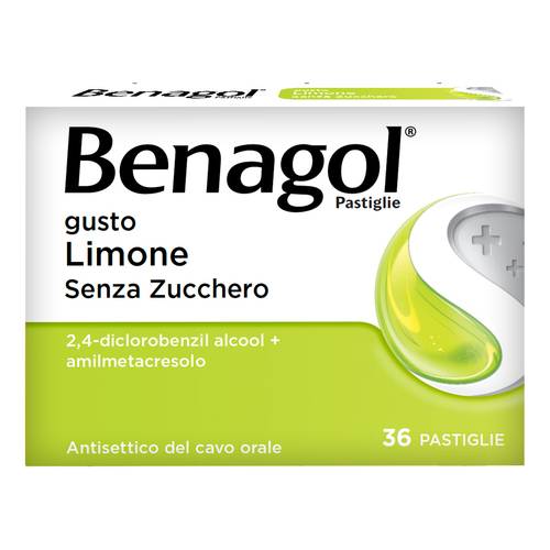 Benagol Pastiglie gusto Ginger e Spezie. Principi attivi: 2,4-diclorobenzil alcool 1,2 mg; amilmetacresolo 0,6 mg. Eccipienti con effetti noti: saccarosio liquido, glucosio liquido (contenente solfiti e amido di frumento), aroma spezie e aroma ginger (contenenti cinnamale, citrale, citronellolo, eugenolo, farnesolo, geraniolo, isoeugenolo e linalolo). Benagol Pastiglie gusto Miele e Limone. Principi attivi: 2,4-diclorobenzil alcool 1,2 mg; amilmetacresolo 0,6 mg. Eccipienti con effettinoti: glucosio liquido (contenente solfiti e amido di frumento), saccarosio liquido, menta essenza e limone essenza (contenenti citrale, d-limonene, geraniolo e linalolo), miele (zucchero invertito). Benagol Pastiglie gusto Limone Senza Zucchero. Principi attivi: 2,4-diclorobenzil alcool 1,2 mg; amilmetacresolo 0,6 mg. Eccipienti con effetti noti:maltitolo liquido, isomalto, aroma di limone (contenente alcol benzilico, citrale, citronellolo, d-limonene, geraniolo e linalolo). BenagolPastiglie gusto Fragola Senza Zucchero. Principi attivi: 2,4-diclorobenzil alcool 1,2 mg; amilmetacresolo 0,6 mg. Eccipienti con effetti noti: maltitolo liquido, isomalto, aroma di fragola (contenente propilene glicole e alcol benzilico). Benagol Pastiglie gusto Menta Fredda. Principi attivi: 2,4-diclorobenzil alcool 1,2 mg; amilmetacresolo 0,6 mg. Eccipienti con effetti noti: saccarosio liquido, glucosio liquido (contenente solfiti e amido di frumento), aroma menta e eucalipto essenza (contenenti glicole propilenico, alcol benzilico, alcol cinnamilico,citrale, citronellolo, d-limonene, eugenolo e linalolo). Benagol Pastiglie gusto Mentolo-Eucaliptolo. Principi attivi: 2,4-diclorobenzil alcool 1,2 mg; amilmetacresolo 0,6 mg; mentolo 8,0 mg. Eccipienti con effetti noti: saccarosio liquido, glucosio liquido (contenente solfiti eamido di frumento) e eucalipto essenza (contenente d-limonene). Benagol Pastiglie con Vitamina C gusto Arancia. Principi attivi: 2,4-diclorobenzil alcool 1,2 mg; amilmetacresolo 0,6 mg; sodio ascorbato 74,9 mg; acido ascorbico 33,5 mg. Eccipienti con effetti noti: saccarosio liquido, glucosio liquido (contenente solfiti e amido di frumento), aromadi arancia (contenente citrale, citronellolo, d-limonene, geraniolo,linalolo), glicole propilenico. Per l'elenco completo degli eccipienti, vedere paragrafo 6.1.