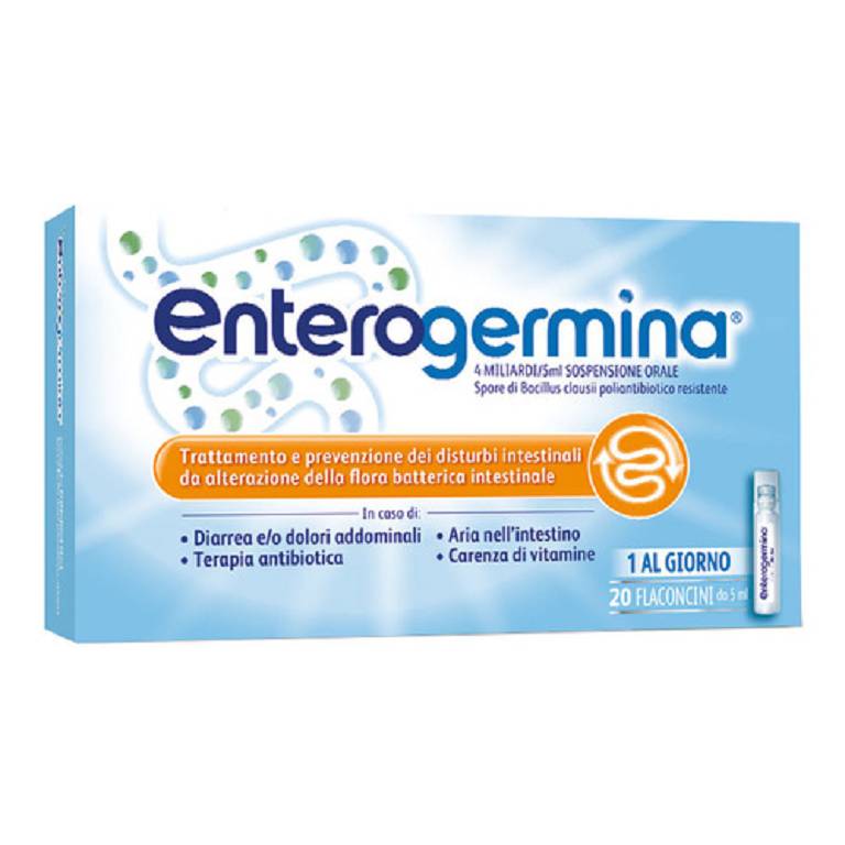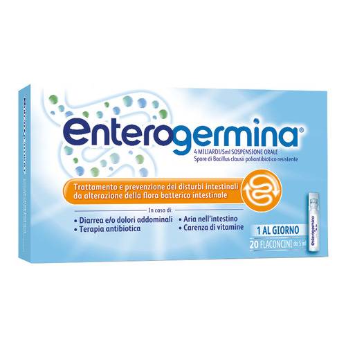 Avvertenze speciali. Batteriemia/sepsi: dopo l'immissione in commerciosono stati segnalati casi di batteriemia, setticemia e sepsi in pazienti immunocompromessi o gravemente malati e in neonati pretermine. Nelcaso di alcuni pazienti malati in condizioni critiche, l'esito e' stato fatale. Enterogermina deve essere evitato in questi gruppi di pazienti (vedere paragrafo 4.8). Questo medicinale e' solo per uso orale. Non iniettare o somministrare per altre vie. Un uso non corretto del medicinale ha provocato reazioni anafilattiche gravi come shock anafilattico. Precauzioni d'impiego: nel corso di terapia antibiotica si consiglia di somministrare il preparato nell'intervallo fra l'una e l'altrasomministrazione di antibiotico. L'eventuale presenza di corpuscoli visibili nei flaconcini di Enterogermina e' dovuta ad aggregati di spore di Bacillus clausii; non e' pertanto indice di prodotto alterato. Agitare il flaconcino prima dell'uso.
