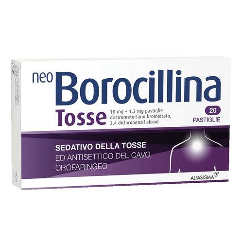 In caso di tosse irritante con una notevole produzione di muco (ad es. nei pazienti affetti da patologie quali bronchiettasia e fibrosi cistica) oppure nei pazienti affetti da malattie neurologiche associate a una marcata riduzione del riflesso della tosse (come ictus, malattia di Parkinson e demenza), il trattamento con il farmaco come sedativo della tosse dovrebbe essere somministrato con particolare cautela e solo su consiglio medico dopo un'attenta valutazione del rischio-beneficio. Vi sono informazioni limitate sull'uso del destrometorfano nei pazienti con compromissione della funzionalita' epatica o renale. Pertanto, Neo Borocillina Tosse pastiglie deve essere somministrato con cautela in tali pazienti, specialmente nei pazienti con compromissione grave. Il destrometorfano e' metabolizzato dal citocromo epatico P450 2D6. L'attivita' di questo enzima e' geneticamente determinata. Circa il 10% della popolazione metabolizza lentamente il CYP2D6. In metabolizzatori lenti e pazienti con uso concomitante di inibitori del CYP2D6 possono manifestarsi effetti esagerati e/o prolungati del destrometorfano. E' necessario pertanto prestare attenzione in pazienti metabolizzatori lenti del CYP2D6 o che utilizzano inibitori del CYP2D6. A causa del potenziale rilascio di istamina, si dovrebbe evitare l'uso in caso di mastocitosi. Una tosse cronica puo' essere un sintomo precoce di asma e quindi non e' indicato per la soppressione della tosse cronica, in particolare nei bambini. Usare con cautela nei pazienti che assumono farmaci serotoninergici (diversi dai farmaci inibitori delle MAO), quali inibitori selettivi della ricaptazione della serotonina (SSRI) (per es. fluoxetina, paroxetina) o farmaci antidepressivi triciclici. L'impiego, specie se prolungato, dei prodotti per uso topico puo' dare origine a fenomeni di sensibilizzazione. In tal caso e' necessario interrompere il trattamento e consultare il medico ai fini della istituzione di eventuale terapia idonea. Dopo 5-7 giorni di trattamento, senza risultati apprezzabili, consultare il medico. Informazioni importanti su alcuni eccipienti Contiene 1,386 g di saccarosio (zucchero) per pastiglia. Da tenere in caso di considerazione in persone affette da diabete mellito. I pazienti affetti da rari problemi ereditari di intolleranza al fruttosio, da malassorbimento di glucosio-galattosio, o da insufficienza di sucrasi isomaltasi, non devono assumere questo medicinale. Il prodotto contiene aspartame, fonte di fenilalanina. E' sconsigliabile durante la terapia l'assunzione di alcool. Il destrometorfano puo' dare una modesta assuefazione. A seguito di un uso prolungato (per es. eccedendo il periodo di trattamento raccomandato), i pazienti possono sviluppare tolleranza al medicinale, cosi' come dipendenza mentale e fisica. Sono stati riportati casi di abuso di destrometorfano. Si raccomanda di prestare particolare attenzione con adolescenti e giovani adulti, nonche' con pazienti con una storia di abuso di farmaci o sostanze psicoattive. I pazienti con tendenza all'abuso o alla dipendenza devono assumere il farmaco per brevi periodi e sotto stretto controllo del medico.